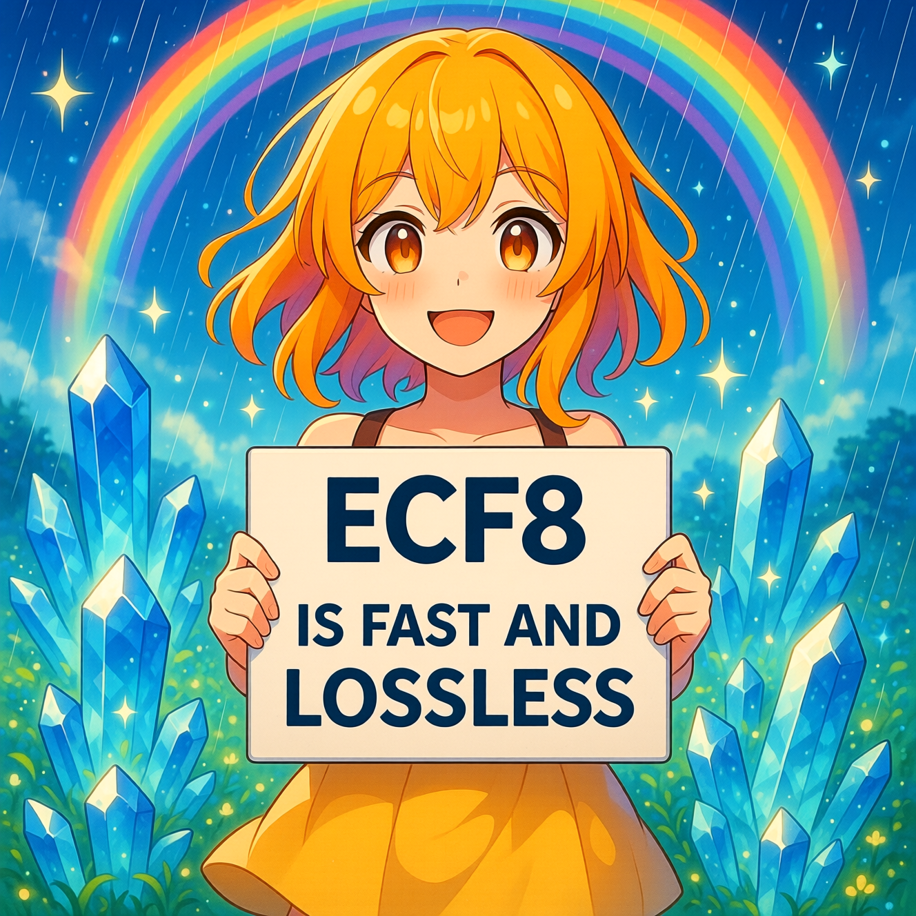 Pixel-identical outputs. ECF8 finished in 13s, 85% faster than FP8 (24s) with pixel-to-pixel identical outputs.